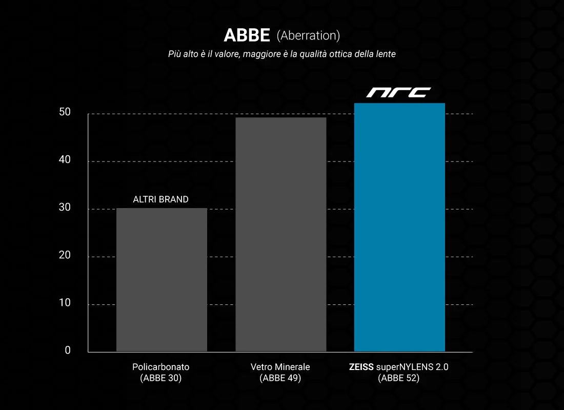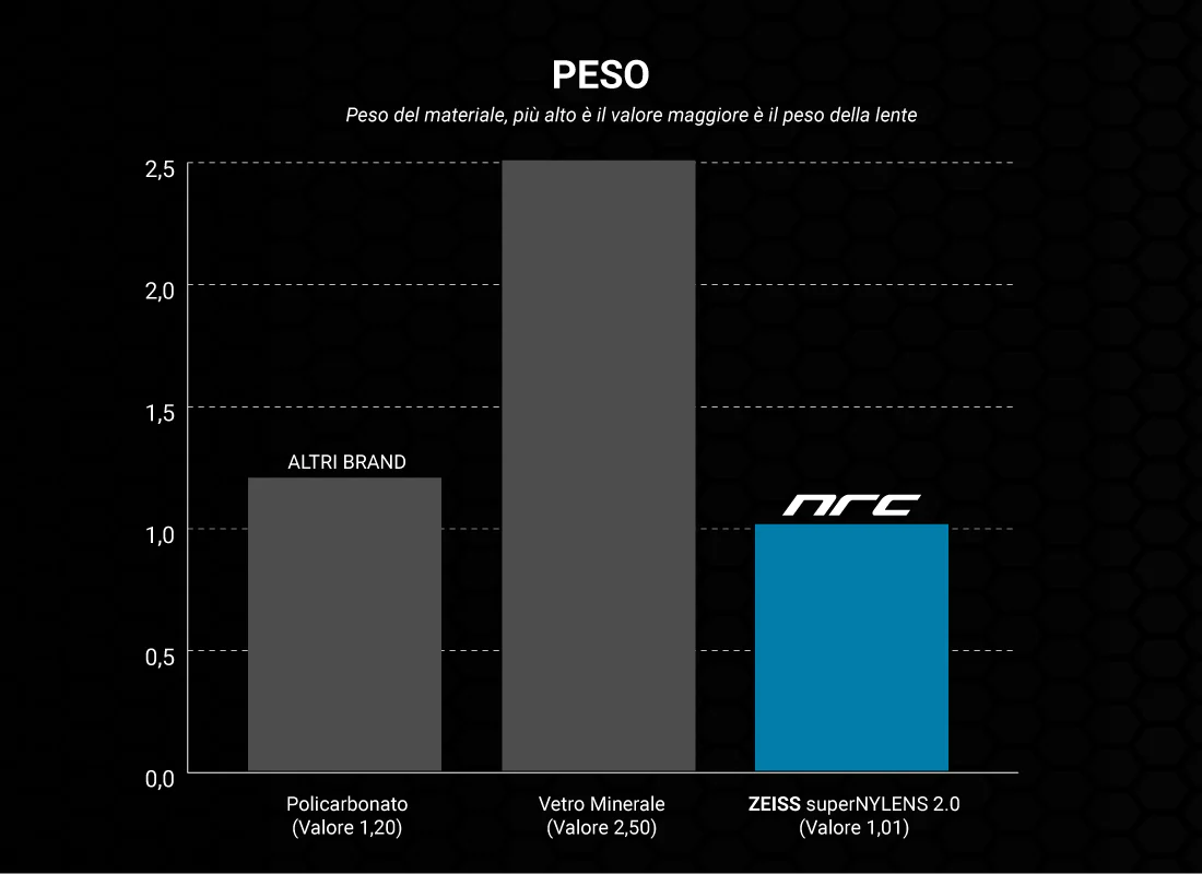Le lenti ZEISS® in Nylon NRC® offrono una qualità ottica oltre +70% rispetto al policarbonato, materiale utilizzato dalla maggior parte degli occhiali sportivi. Il risultato è una combinazione unica di leggerezza, resistenza e nitidezza, tipica del mercato del lusso, dove il Nylon ZEISS® è normalmente riservato a occhiali dal valore superiore ai 400 €.